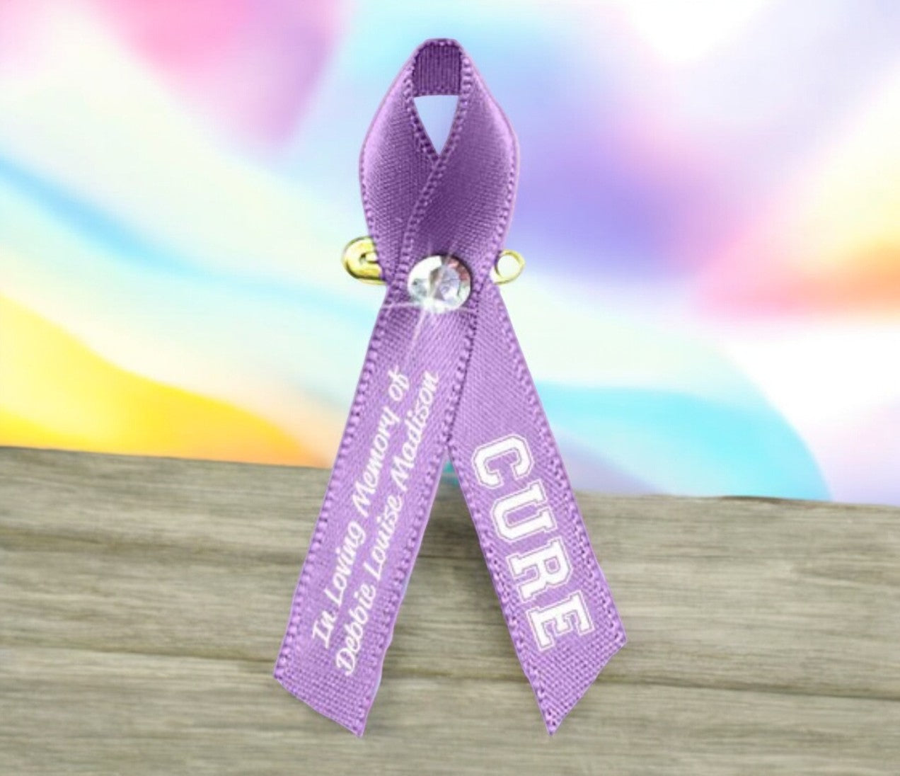 Ready to wear cancer ribbons are a great way to promote awareness of any cause. Wear them proudly to show support and spark conversations about important causes. Custom made to order personalized with 3 lines of text, if desired. Can be ordered with no text.