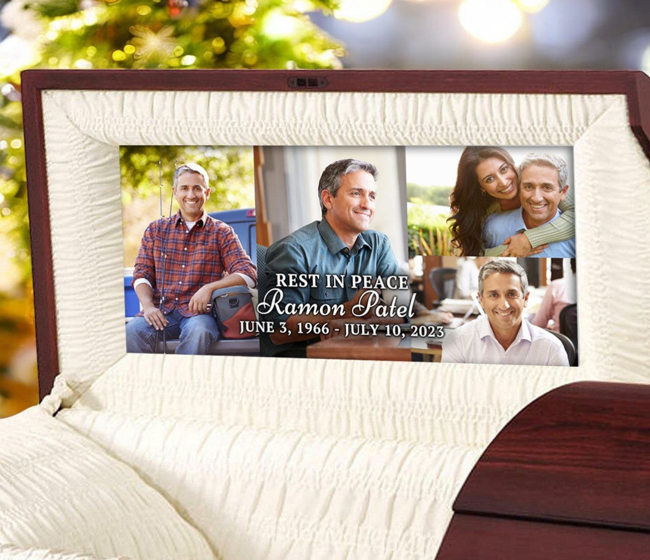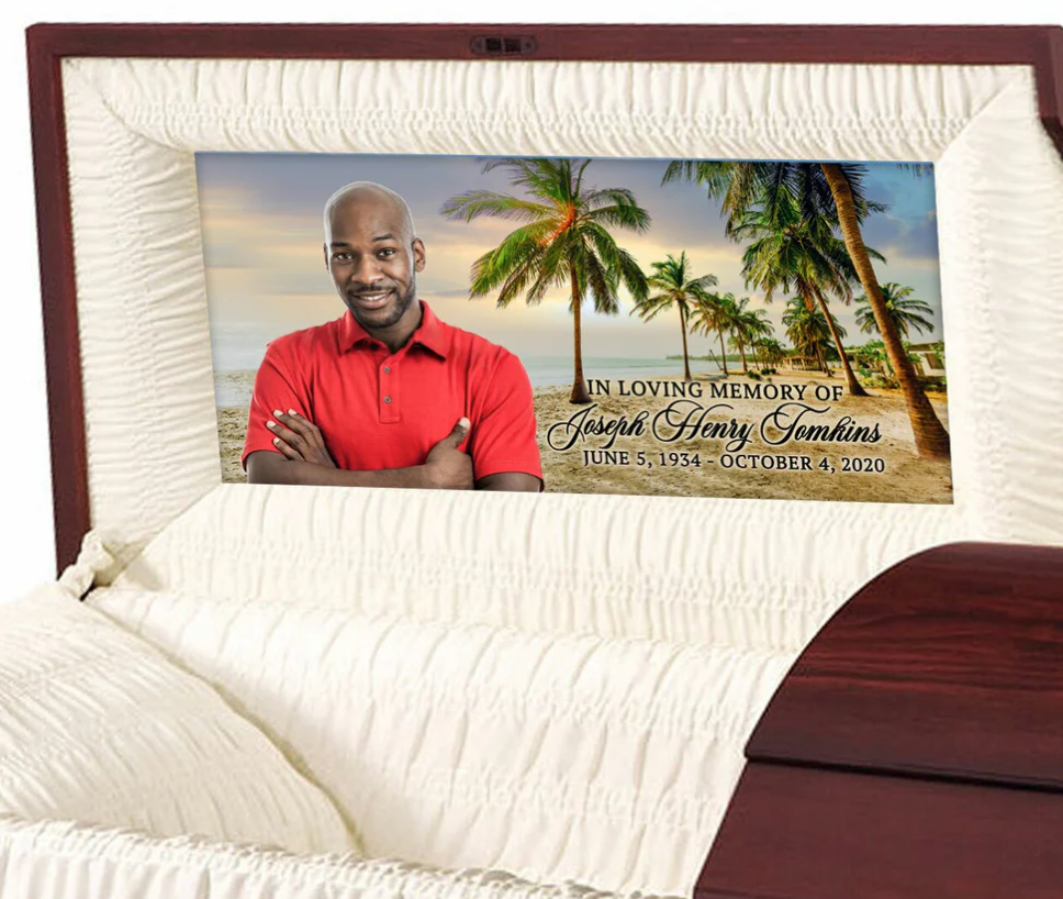 A custom casket panel is an insert that fits inside the casket’s lid and is typically visible during the viewing or open-casket portion of a funeral. Standard casket interiors are usually lined with satin, velvet, or another plush fabric. In contrast, custom panels can be adorned with anything from a favorite photograph, a meaningful quote, landscapes, religious symbols, or even artwork. This feature adds a deeply personal touch to the service, turning the casket into a more poignant tribute to the deceased.