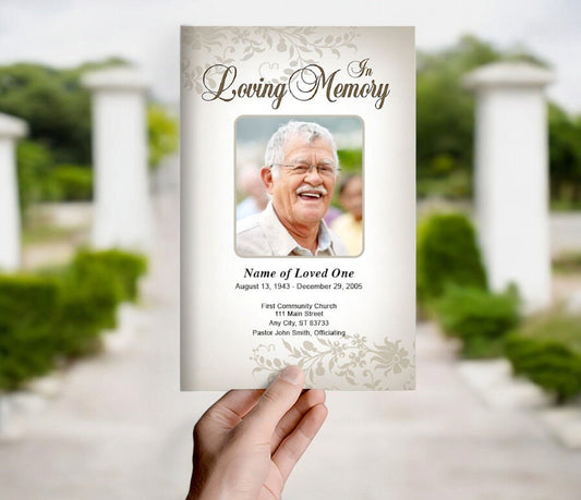 Floral-themed funeral program designs offer a gentle and visually appealing way to celebrate the life of a loved one. These designs typically incorporate a variety of floral patterns that can range from subtle watercolor blossoms to vibrant, bold blooms, each adding a touch of natural beauty to the program. Flowers often carry specific meanings and can be chosen to reflect the personality or preferences of the deceased; for example, roses might signify love and respect, while lilies often represent purity and renewal. This thematic choice not only beautifies the funeral program but also infuses it with deeper symbolic significance, making the ceremony more personal and reflective of the individual being honored.