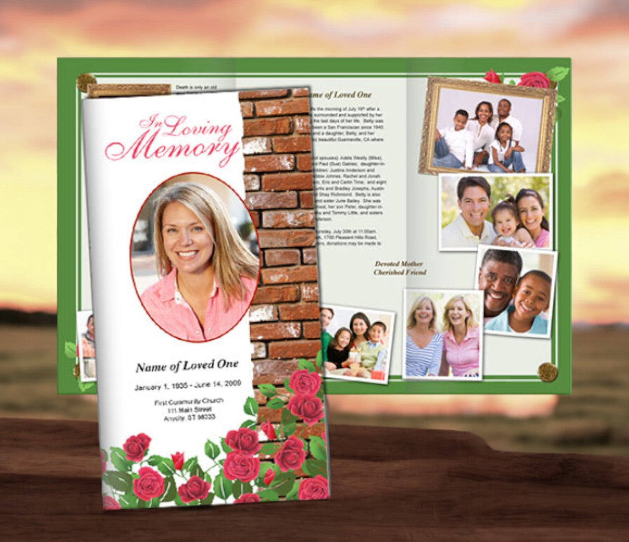 Funeral brochures typically include a biography, photos, the order of service, tributes, poems or scripture, and acknowledgments.