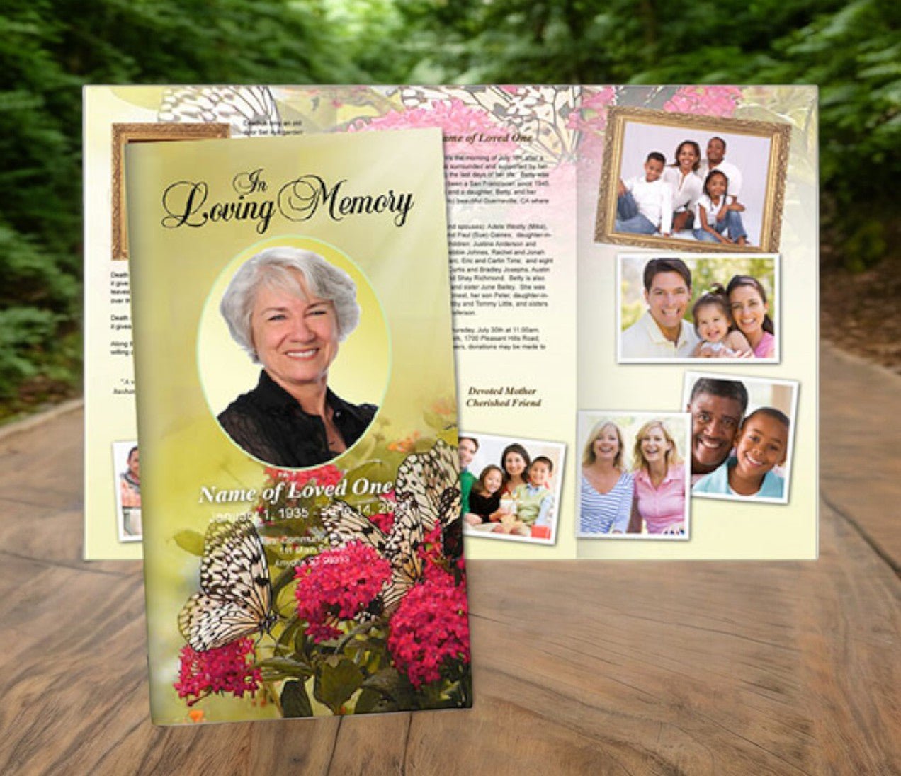 A funeral brochure is a multi-panel printed document that provides detailed information about a memorial service and celebrates the life of the deceased.