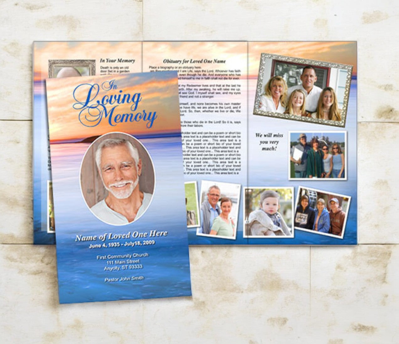 Attendees can easily carry them home as a lasting reminder of the memorial service, creating a cherished keepsake that can be revisited in moments of reflection. Family and friends often find solace in flipping through the pages, reminiscing about the life that was celebrated and the shared moments of grief and remembrance. In an era where digital communication prevails, funeral brochures maintain a tangible and timeless quality. While digital alternatives exist, the physicality of a brochure provides a tangible connection to the memorial service and the person being honored. It serves as a meaningful artifact, capturing the spirit of the occasion and preserving the memory of the departed in a way that transcends the digital realm. In conclusion, funeral brochures are more than informational documents; they are poignant tributes that encapsulate the essence of a memorial service.