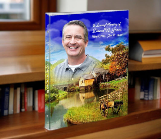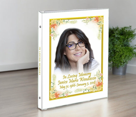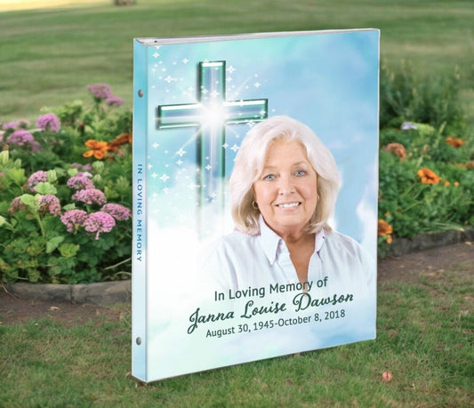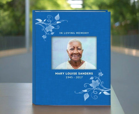 We offer custom funeral guest books in two sizes with the cover and inside pages done to your liking. A complete memorial with pages personalized especially for your loved one. Experience the customization options of our funeral guest books, designed to reflect your personal style and preferences.