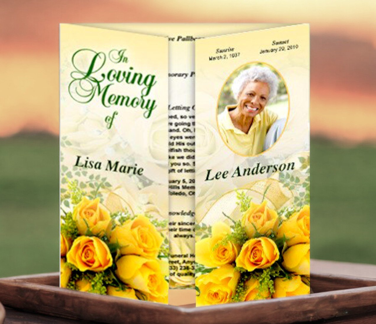 You can include photos, the order of service, tributes, a biography, poems, scriptures, and acknowledgments, with sections divided across the folded panels.