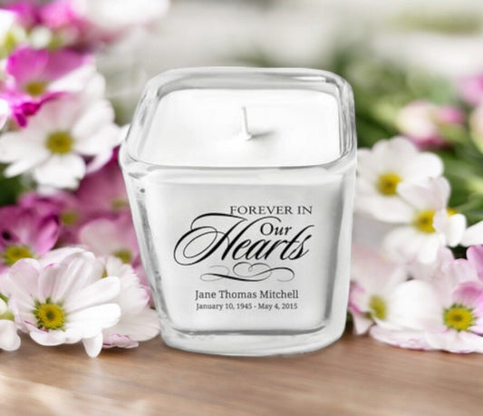 A soft flickering light illuminates from our votive glass memorial candles with your special text placed on the front. Illuminate your space with a personalized touch using our conveniently size votive memorial candles.