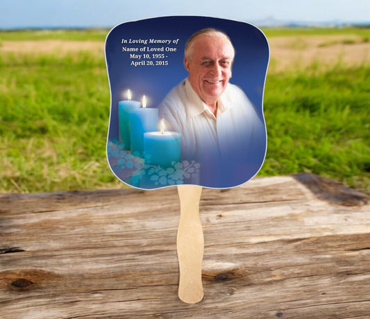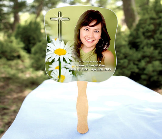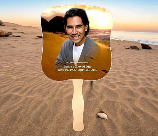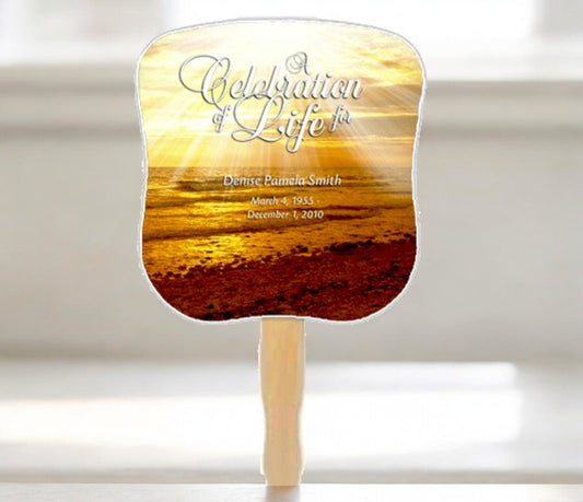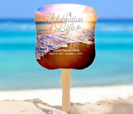 Memorial fans, affectionately known as In Loving Memory hand fans, offer a thoughtful blend of practical utility and heartfelt sentiment, particularly poignant in warm climates or during the sweltering summer months. Crafted from durable materials such as sturdy card Stock or soft fabric, these fans are designed with a handle for easy maneuverability. Their dual purpose becomes apparent as they provide respite from the heat while simultaneously serving as poignant tokens of remembrance at funeral services. The front face of these fans often showcases serene imagery, carefully selected to evoke tranquility and comfort amidst the solemnity of the occasion. Whether it's a peaceful landscape scene or an emblem of religious significance, the visual elements seek to soothe mourners and offer a moment of solace. Meanwhile, the reverse side provides a canvas for personalization, allowing families to inscribe the name of the departed, their dates of birth and passing, and a heartfelt memorial message or verse. This personalized touch not only honors the memory of the loved one but also offers attendees a tangible keepsake to cherish long after the service has ended.