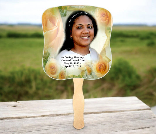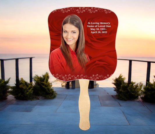 Memorial fans are personalized handheld fans created for funerals or memorial services. They serve both a practical purpose and as a keepsake to honor the memory of the deceased.