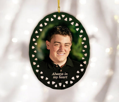 The Oval In Memory Christmas Ornament is a beautiful way to honor a loved one during the holiday season. This special ornament features your full-color or black-and-white photo imprinted directly onto a ceramic oval doily shape, creating a timeless keepsake. The delicate open-heart trim encircles the entire ornament, symbolizing love and remembrance. Whether placed on your Christmas tree or displayed year-round in your home, the Oval In Memory Christmas Ornament serves as a heartfelt tribute, reminding you that your loved one's presence is always near.