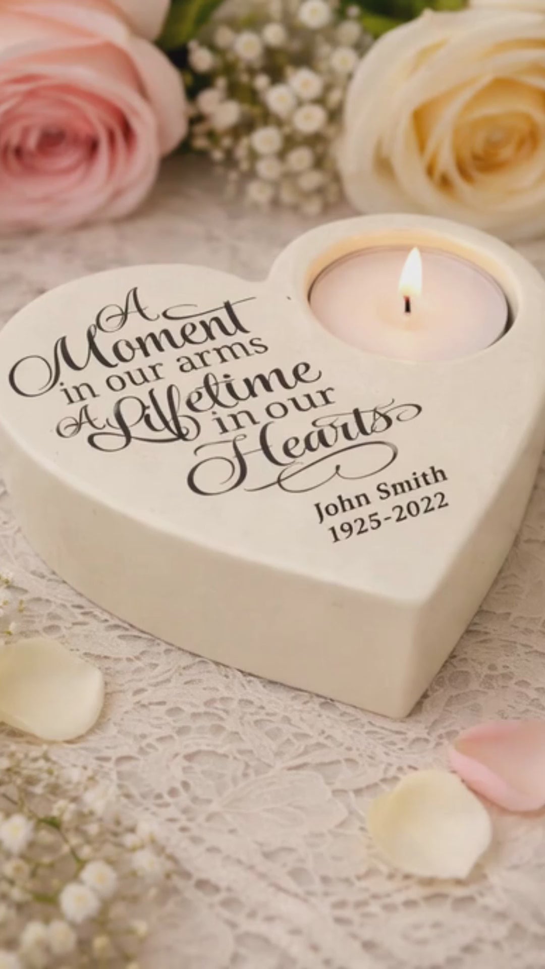 The Tea Light Memorial Candle Holder is a heartfelt way to honor and cherish the memories of a loved one. Designed in a beautiful heart shape, this elegant piece serves as a gentle reminder of the love and warmth shared. The included tea light provides a soft, flickering glow, symbolizing the light that remains in our hearts even when someone is no longer physically present. Engraved with the touching quote, "A Moment In Our Arms, A Lifetime In Our Hearts," this Tea Light Memorial Candle Holder offers comfort and solace during moments of remembrance.