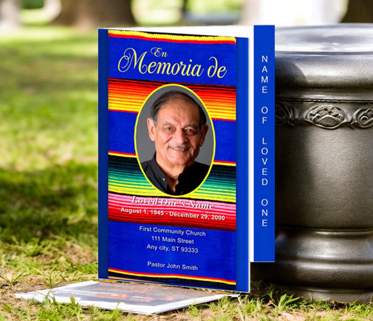 The Graduated Funeral Program Template is a bright, vibrant, and uniquely designed Hispanic-themed template, perfect for honoring a loved one's life with cultural richness and elegance. This 4-sided, graduated, offset-fold format adds a dynamic and visually appealing presentation, making it a standout choice for any memorial service. The layered design allows for easy navigation, ensuring that the program flows seamlessly while maintaining a polished and professional look.