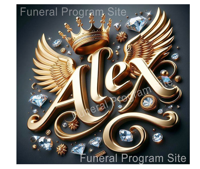 The Funeral Program Site presents the Alex 3D Word Art Name Design, showcasing the name “Alex” in a brilliant gold finish with striking 3D depth and intricate embellishments. Sparkling diamonds, luminous highlights, delicate wings, and a regal crown elevate the design into a statement piece of elegance and charm. Each detail is thoughtfully arranged to enhance the luxurious appearance and powerful visual impact. Created for those who appreciate distinctive and eye-catching personalization, the Alex 3D Word Art Name Design radiates sophistication and meaning. Ideal for décor, gifts, or memorial keepsakes, it serves as a bold golden symbol of pride, remembrance, or celebration. With its artistic detailing and refined presentation, The Funeral Program Site’s Alex 3D Word Art is a keepsake designed to be admired and treasured.