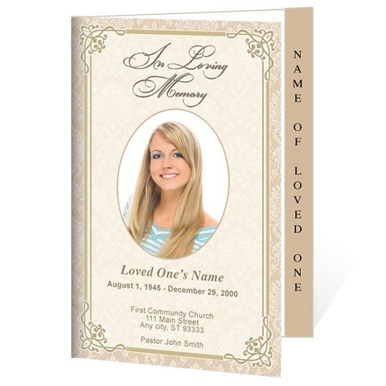 The Alexandria 4-Sided Graduated Funeral Program Template offers a refined and timeless design, featuring a soft floral pattern set against a warm light tan background. Elegant ornate framing and a parchment-style center create a graceful space to highlight a cherished photo and personalized memorial text. This best-selling template combines classic beauty with gentle sophistication, making it ideal for honoring a loved one with dignity and warmth. The Alexandria 4-Sided Graduated Funeral Program Template provides a clean and organized layout for sharing service details and tributes.