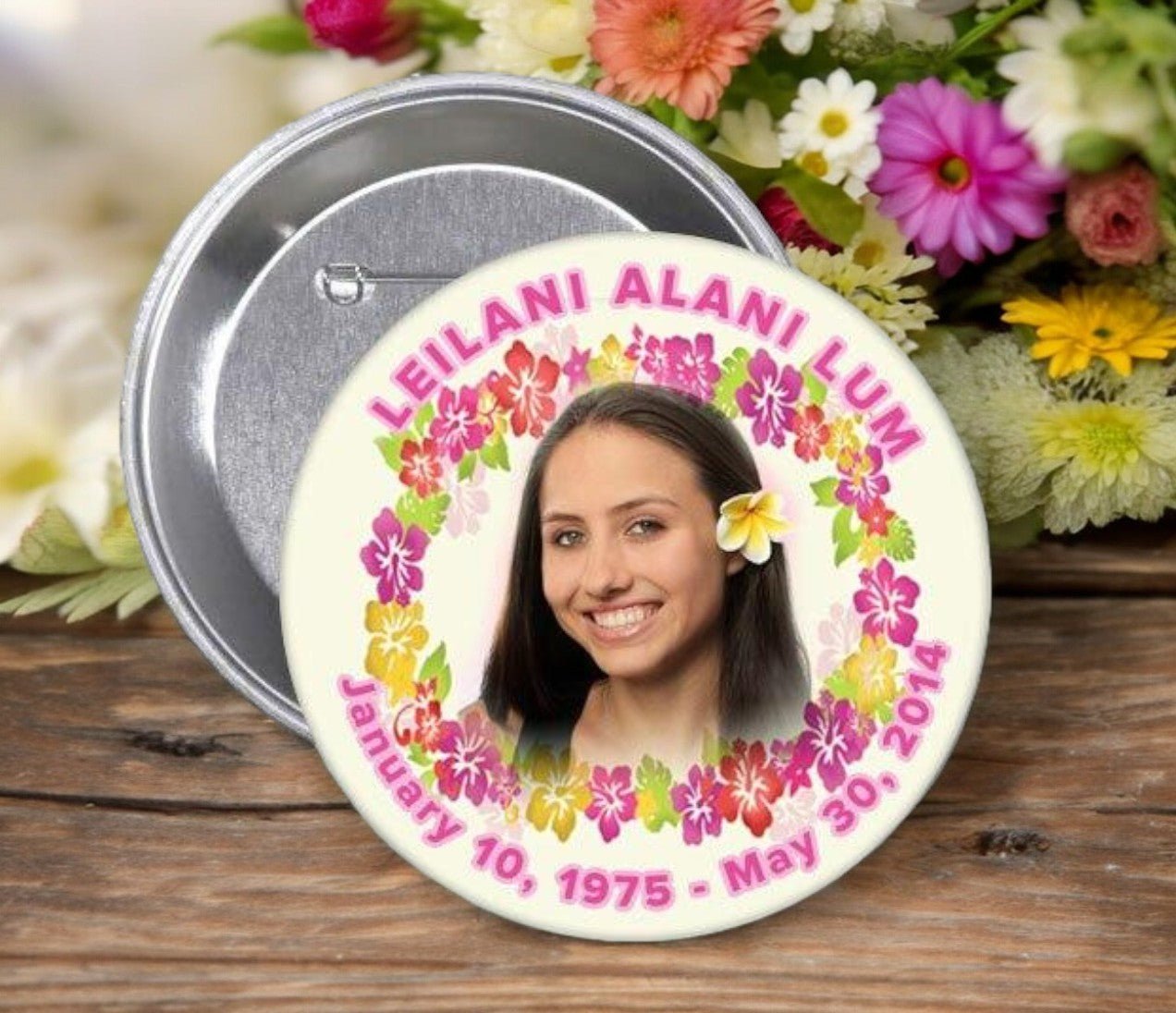 This pack of 10 memorial buttons allows family and friends to carry a meaningful keepsake with them or display it during services, gatherings, or remembrance events. The vibrant colors and floral lei embrace your chosen photo with comfort and celebration, making this a truly touching tribute filled with warmth and spirit.