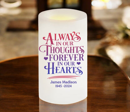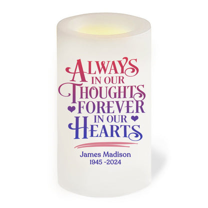 The Always Heart Personalized Flameless LED Memorial Candle is a beautiful and heartfelt tribute to a loved one. With the words 'Always in our thoughts, forever in our hearts' in elegant typography and soft pink and purple tones, this candle serves as a lasting reminder of cherished memories. Personalized with the name and dates of your loved one, it emits a gentle, flameless glow, providing a safe and enduring light of remembrance. Whether used as home decor, at a memorial service, or as a thoughtful sympathy gift, this candle offers comfort and a symbol of love that will be treasured forever.