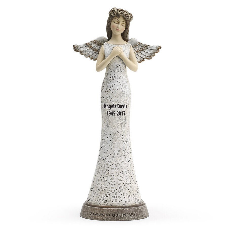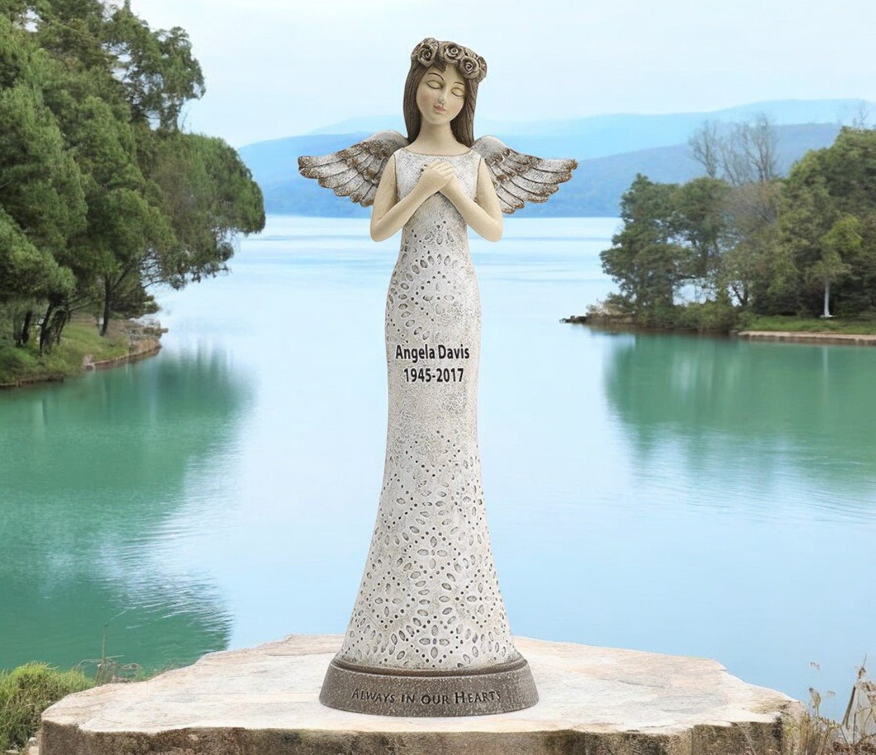 The Always In Our Hearts In Loving Memory Angel Figurine is a heartfelt tribute designed to honor a loved one’s enduring presence. This graceful angel stands tall with her hands gently clasped over her heart, symbolizing eternal love and remembrance. A delicate flower wreath rests upon her head, adding a soft, peaceful touch that reflects warmth and serenity. The engraved phrase “Always In Our Hearts” at the base serves as a tender reminder that although your loved one may no longer be physically present, their memory continues to live on in spirit.