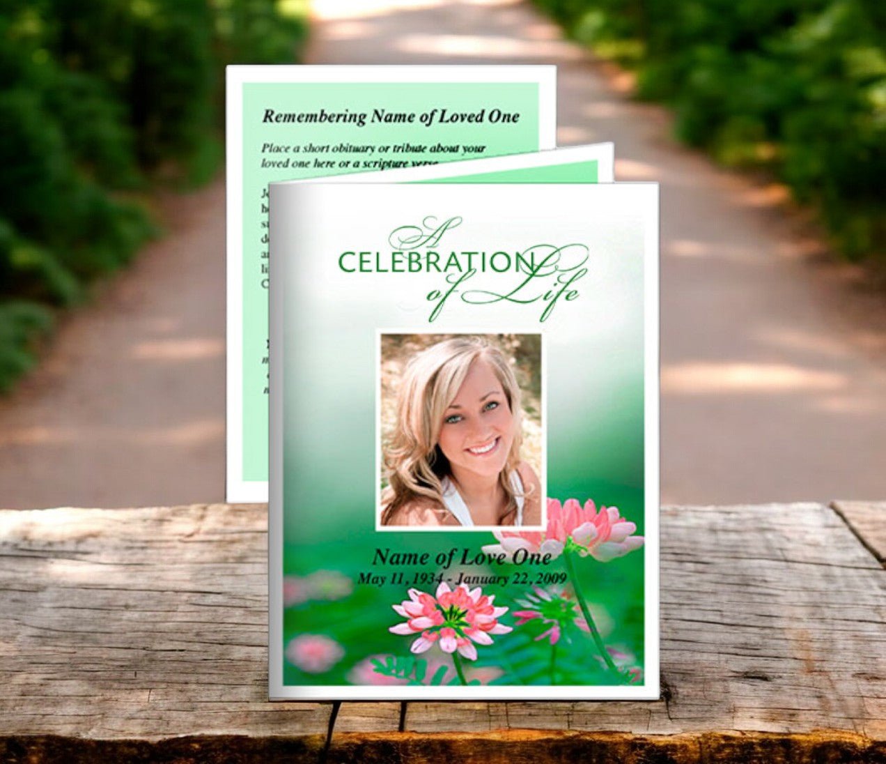 The Ambrosia Small Memorial Card Template features a delightful green backdrop with exquisite pink blossoms on the front, creating a vibrant and serene tribute. The lush green tones symbolize renewal and growth, while the soft pink blossoms add a touch of beauty and warmth.