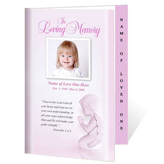 The Angela 4-Sided Graduated Funeral Program Template offers a soft and spiritually inspired design, showcasing a graceful angel adorned with delicate lace eyelet trim. This comforting visual creates a peaceful and reverent atmosphere, making it a beautiful tribute to a loved one guided by faith. The Angela 4-Sided Graduated Funeral Program Template features a graduated offset layout with space for a photo and personalized memorial details on the front cover.