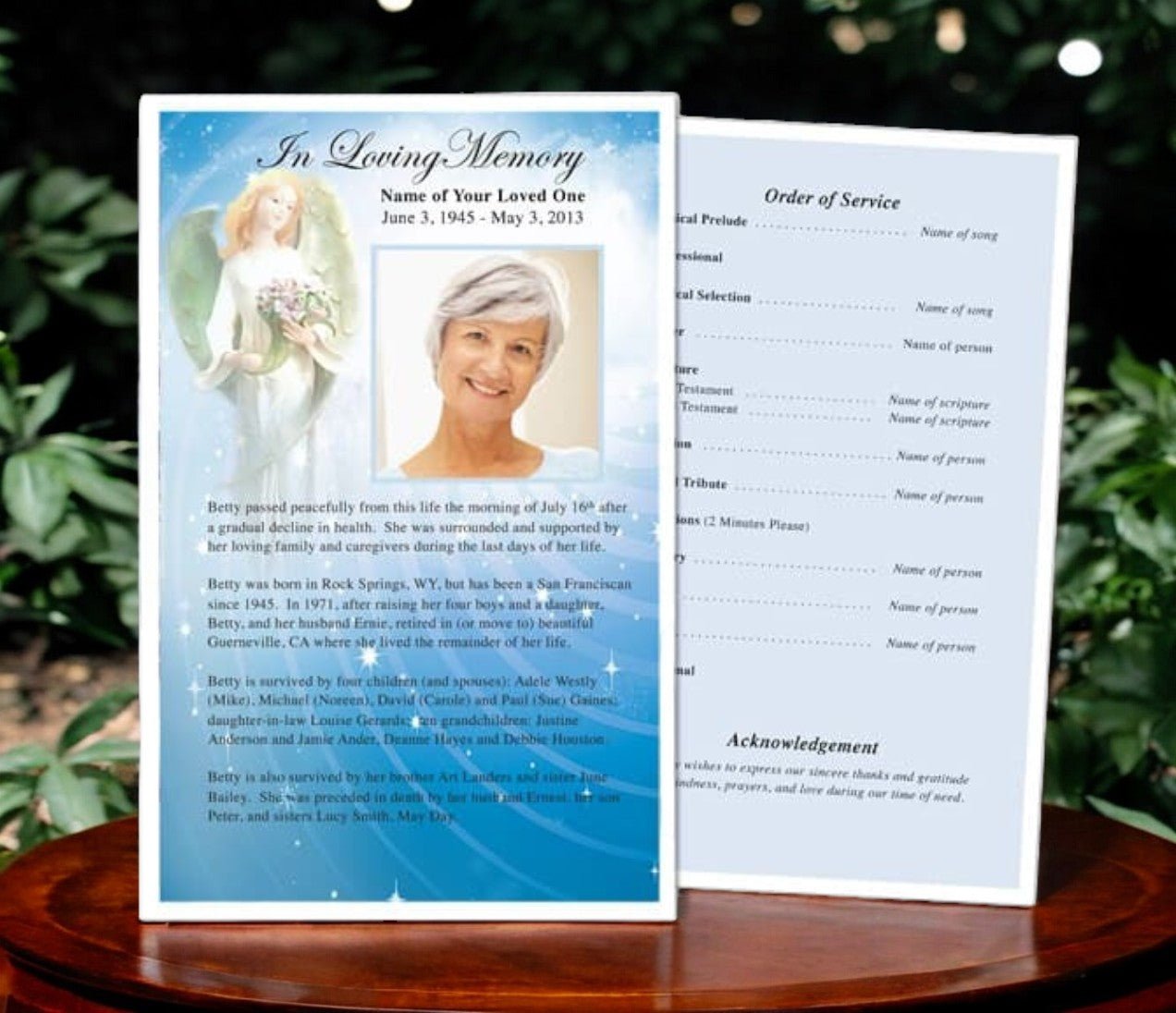 DIY funeral flyer templates for immediate download. Choose from our half sheet or full sheet funeral flyers in many different types of themes. Funeral flyer templates offer a convenient and customizable solution for families looking to create a touching and professional-looking tribute for their loved ones. These templates come in a variety of styles and formats, catering to different tastes and requirements, and allow for quick personalization with photos, text, and design elements. By providing a structured layout, these templates ease the burden of design from grieving families, enabling them to focus on the content that honors the memory of the deceased while ensuring a polished and cohesive look. This accessibility not only simplifies the process during a difficult time but also helps in creating a meaningful and lasting memorial piece.