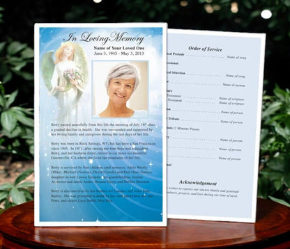 The Angelic Funeral Flyer Template features a glimmering backdrop with a divine figure beside a photo of the decedent, symbolizing peace, comfort, and divine connection. The Angelic Funeral Flyer Template is perfect for honoring a loved one with a spiritual connection, offering a serene and uplifting tribute. The divine imagery evokes feelings of eternal love and remembrance.