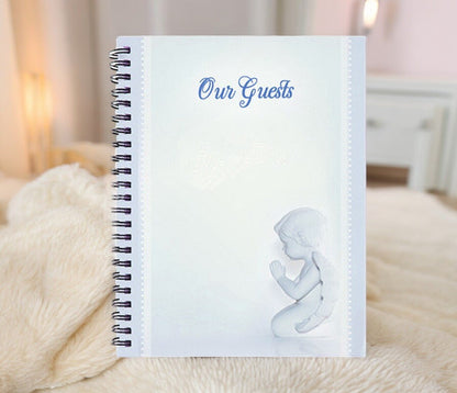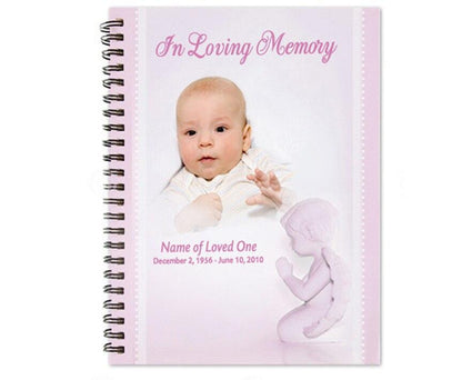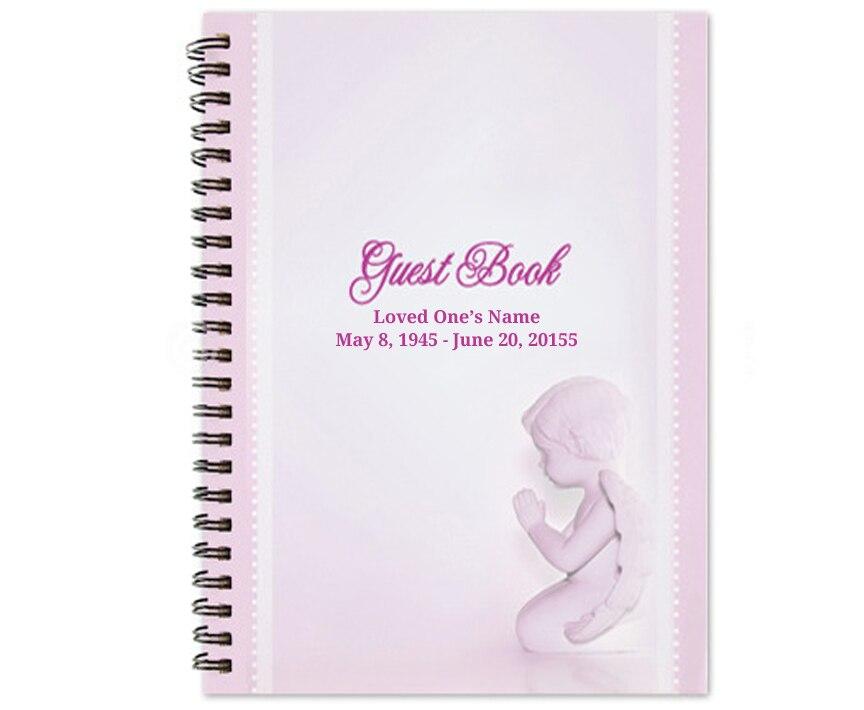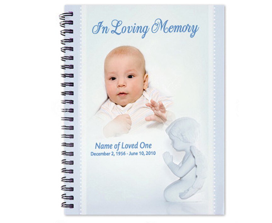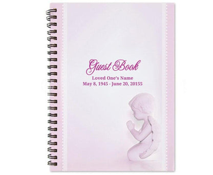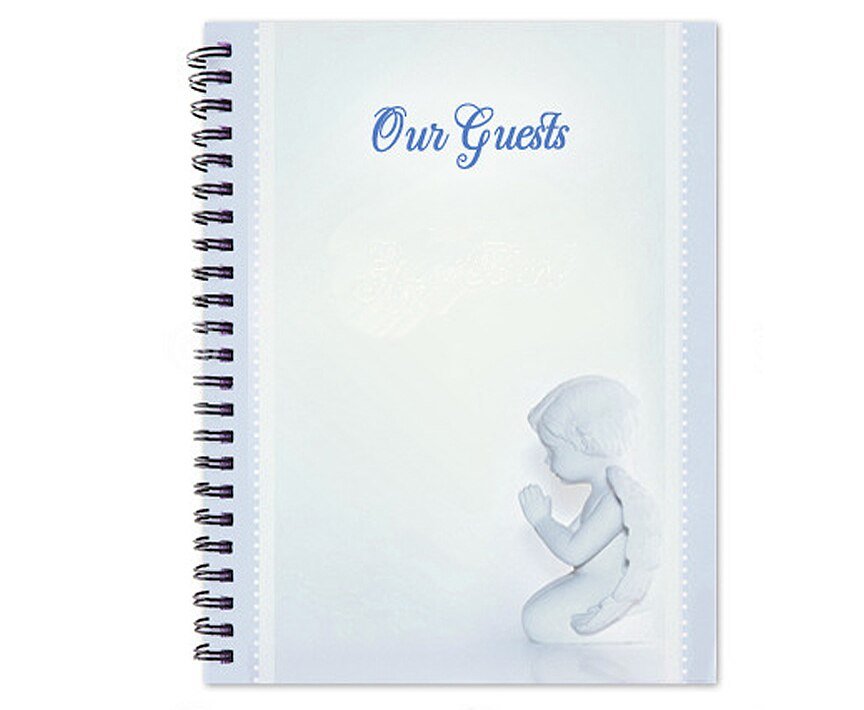 This wire bound funeral guest book offers a sweet and delicate design with lace trim ribbon and small cherub with praying hands perfect for a little boy. Expertly designed to commemorate the life of a young boy, with elegant lace trim, a charming cherub, and an ideal size to record heartfelt messages from guests.