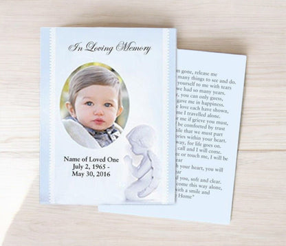 The Angelo Small Memorial Card Template features an ethereal light blue background with a serene image of an angelic cherub kneeling in the foreground, symbolizing peace, protection, and spiritual remembrance. The delicate Angelo Small Memorial Card Template design offers a calming and comforting tribute to a loved one.