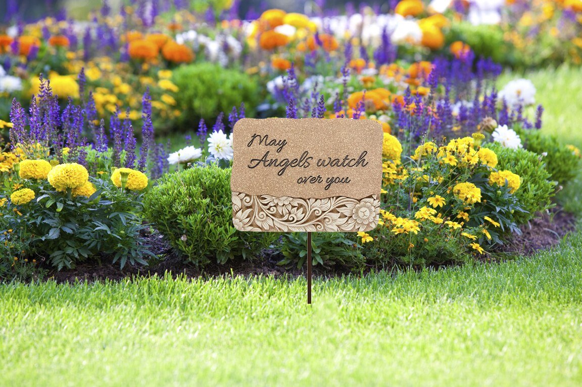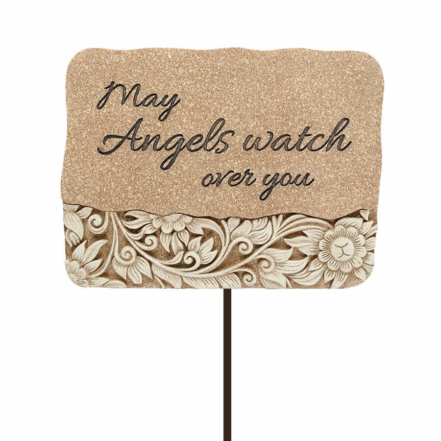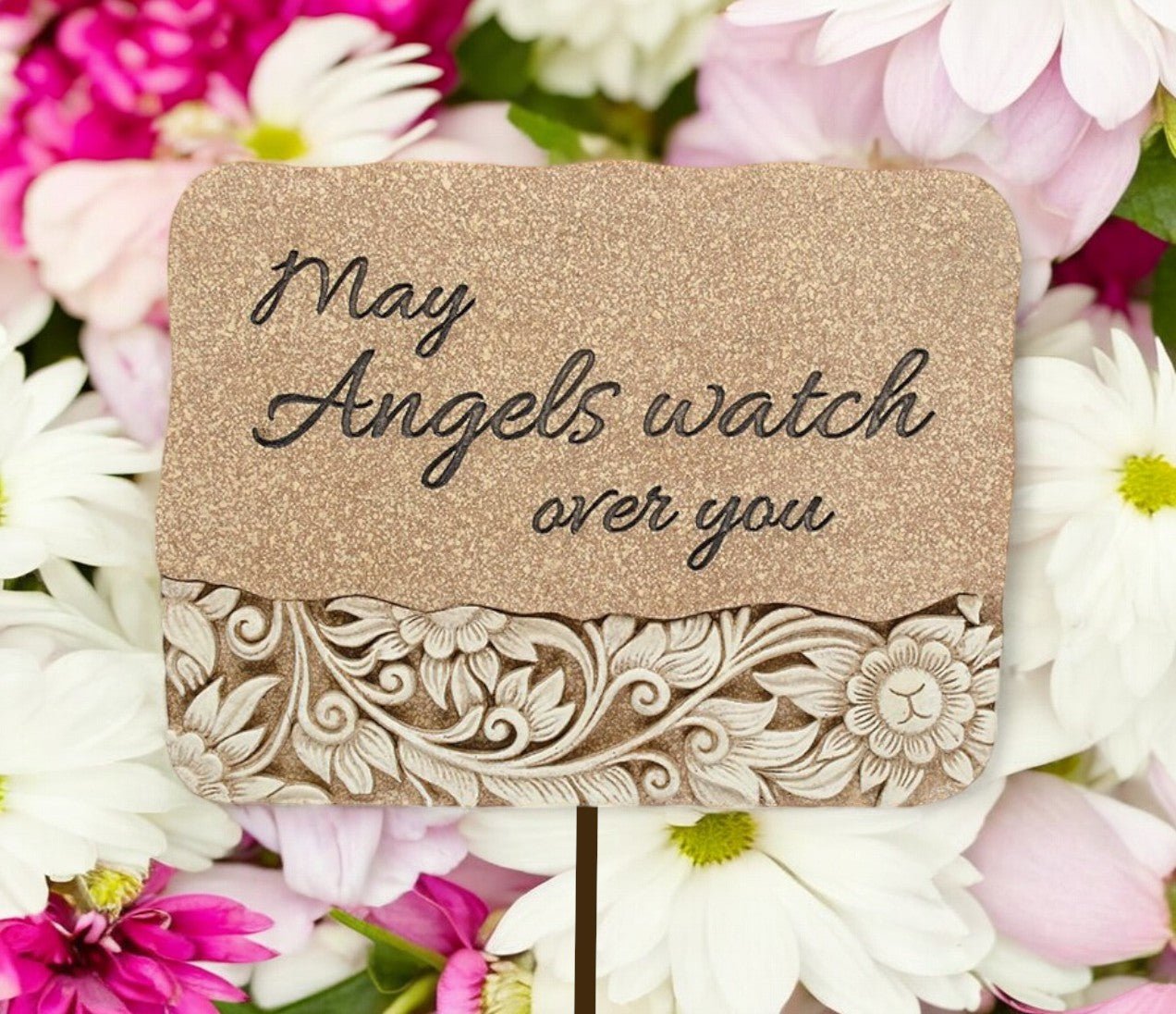Angels Watch Resin Garden Stake from The Funeral Program Site is a touching tribute designed to bring comfort and remembrance to any space. This beautifully crafted piece features elegant scroll flourishes and a heart-shaped border with the heartfelt message, “May Angels Watch Over You,” gracefully inscribed above. Cast in durable resin to resemble hand-carved stone with antique bronze and silver finishes, this memorial stake adds a timeless touch to any setting.