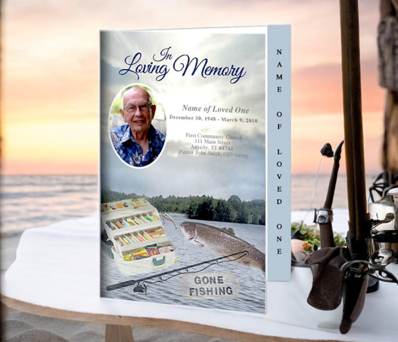 Inside, one panel of the Angler 4-Sided Graduated Funeral Program Template is fully customizable to include the full name of the deceased or a meaningful message. The coordinated interior offers room for the obituary, order of service, or a favorite poem. This template serves as a thoughtful keepsake, celebrating a life well-lived in quiet moments and cherished memories by the water.