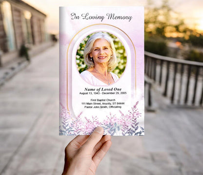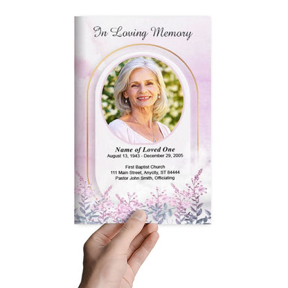 Honor your loved one with The Funeral Program Site’s Archway Online Funeral Program Template, featuring a beautiful pair of watercolor blossom florals elegantly placed along the side of a clean white backdrop. This refined design transforms any funeral program into a work of art, offering a serene and heartfelt tribute that celebrates a cherished life.