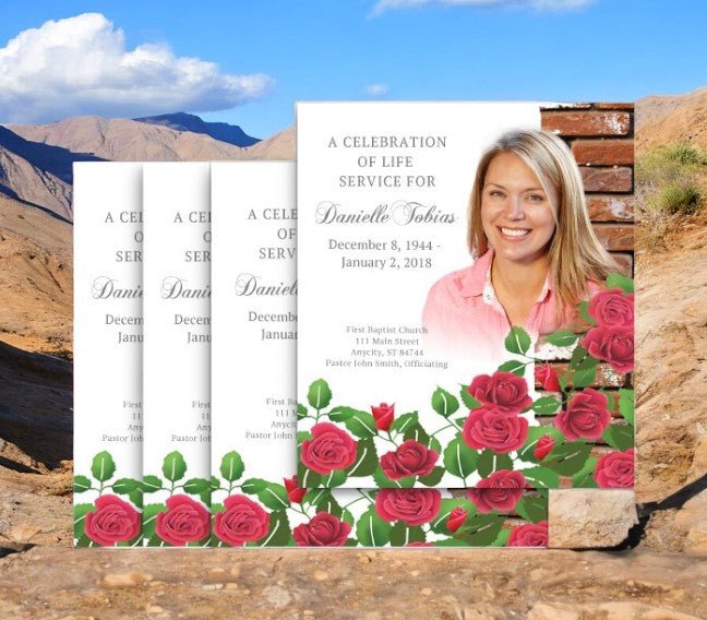 The Austere Memorial Cards Done For You Design & Print (Pack of 50) features a refined design with deep red roses gracefully lining the bottom border and a brick wall accent along the right edge, all set against a clean white background. This elegant combination creates a striking and timeless tribute, perfect for honoring your loved one’s memory with warmth and sophistication.