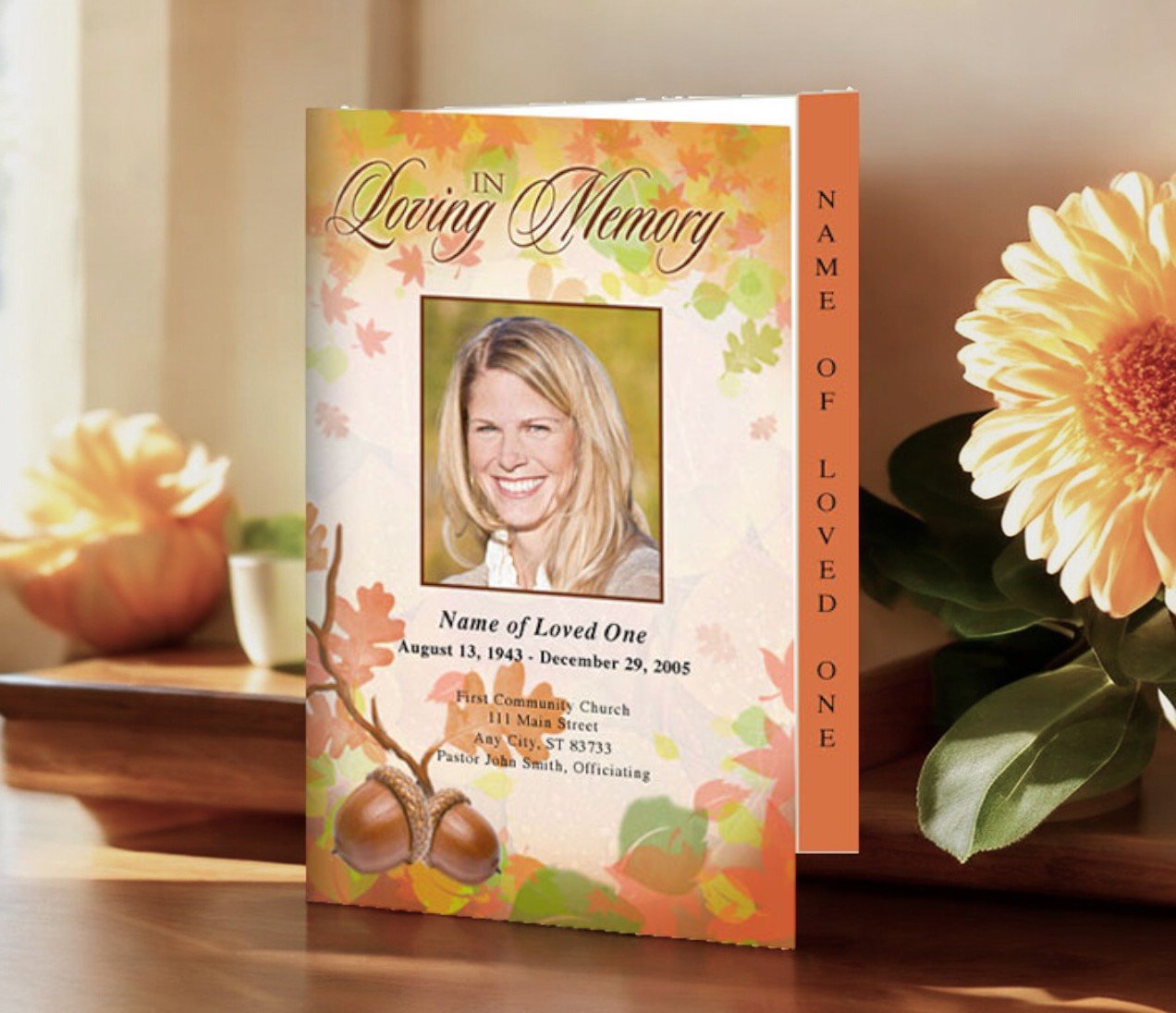 The Autumn 4-Sided Graduated Funeral Program Template captures the warmth and beauty of the fall season with its coral orange leafy backdrop adorning both the front and back covers. Delicate acorn accents at the top and bottom borders add a rustic charm, making it a perfect tribute for someone who loved the colors and spirit of autumn. The Autumn 4-Sided Graduated Funeral Program Template includes elegant word art reading "In Loving Memory," which can be replaced with your own custom text and fonts by creating a new text box on the front cover.