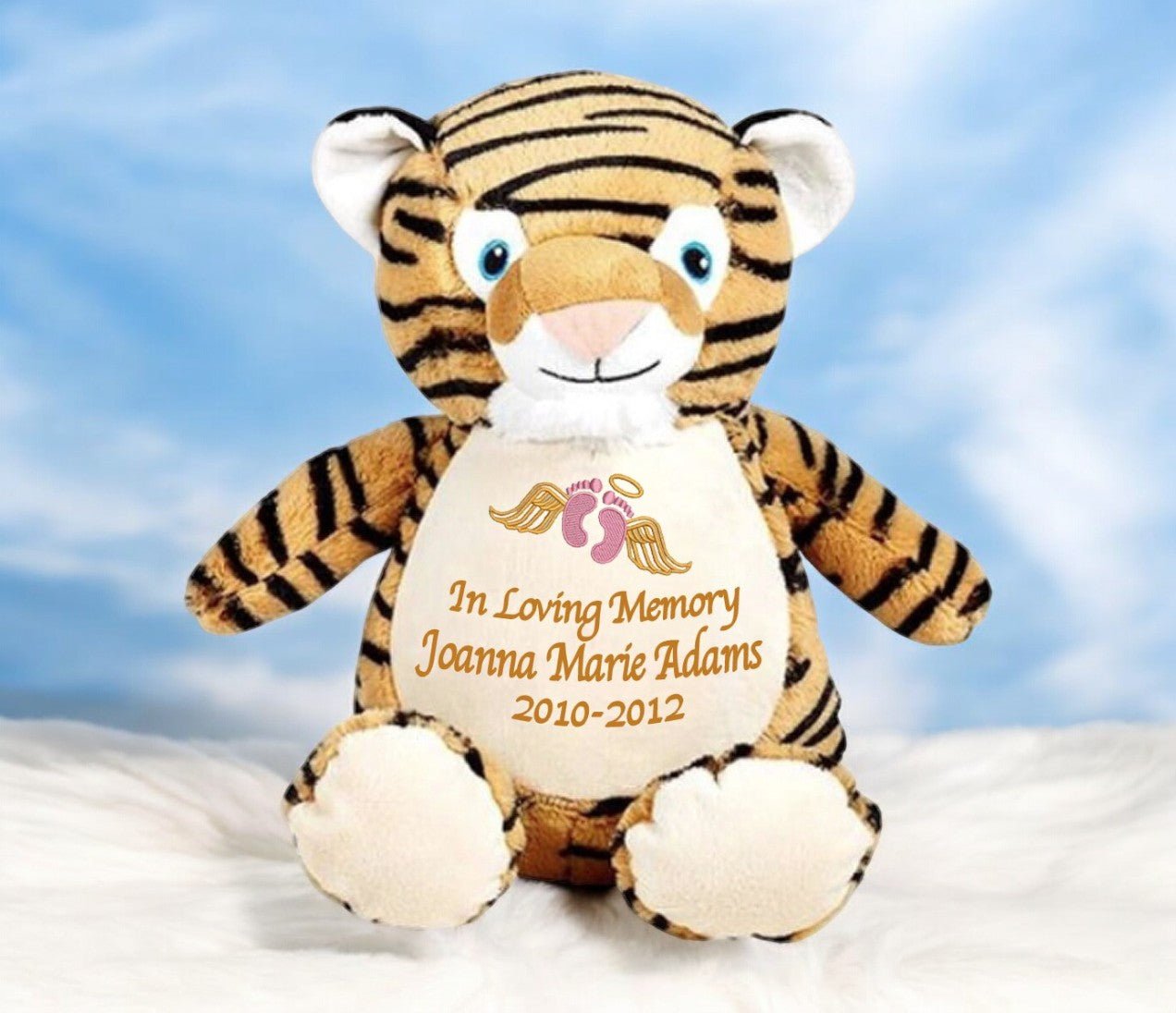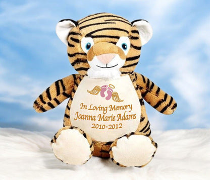 Honor the memory of a cherished little one with the Baby Tiger Memorial Stuffed Animal Urn from The Funeral Program Site. Featuring a soft striped fur body with solid-colored feet and belly, this adorable keepsake is personalized with our quality embroidery service, displaying three lines of custom text accented by tiny wings above the wording.