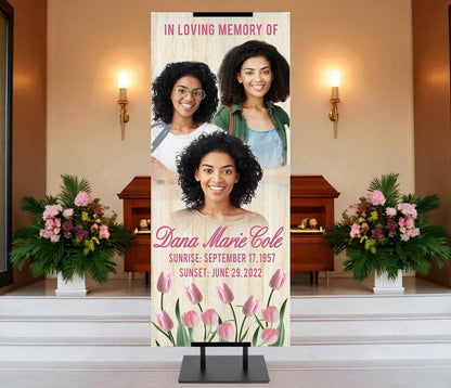 Capture your cherished memories with our Pink Tulips Funeral Banner. This customizable banner features a beautiful floral design of pink tulips and a soft wood grain backdrop. Your favorite photo(s) will be seamlessly integrated into the design, with the background removed for a clean and professional look. Measuring 24' wide by 60' long, or 2 ft. wide by 5 ft. long, our Pink Tulips Funeral Banner is perfect for displaying at any event or in your home. You can easily adhere it to any surface or wall using tack or tape, or use our optional banner stand for a more polished presentation.