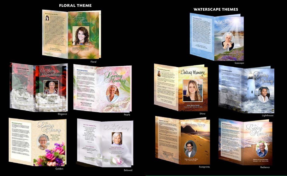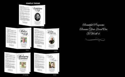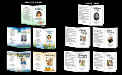 The Basic Starter 30 BiFold Funeral Program Software Package provides a versatile and affordable collection of templates designed to help you create polished and meaningful memorial programs. This package includes 30 of our best-selling letter-size center-fold templates, featuring 5 waterscape themes, 5 outdoor designs, 5 floral styles, 5 Christian-themed layouts, 5 less-color options, and 5 simple designs. With this balanced variety, you have an excellent foundation for creating programs suited to a wide range of families and service styles.