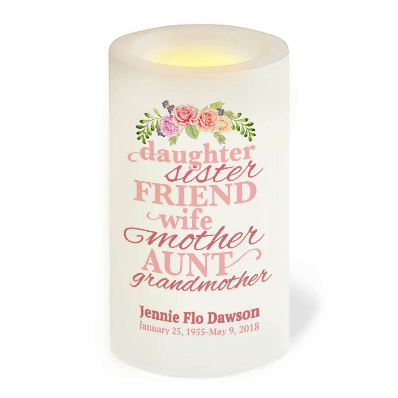 For the special woman in your life who served as your inspiration and source of wisdom—whether she was your sister, mother, aunt, grandmother, or wife—her memory deserves to be honored in a heartfelt way. This beautifully designed memorial candle captures her spirit with delicate word art that reflects the many roles and love she shared throughout her life.