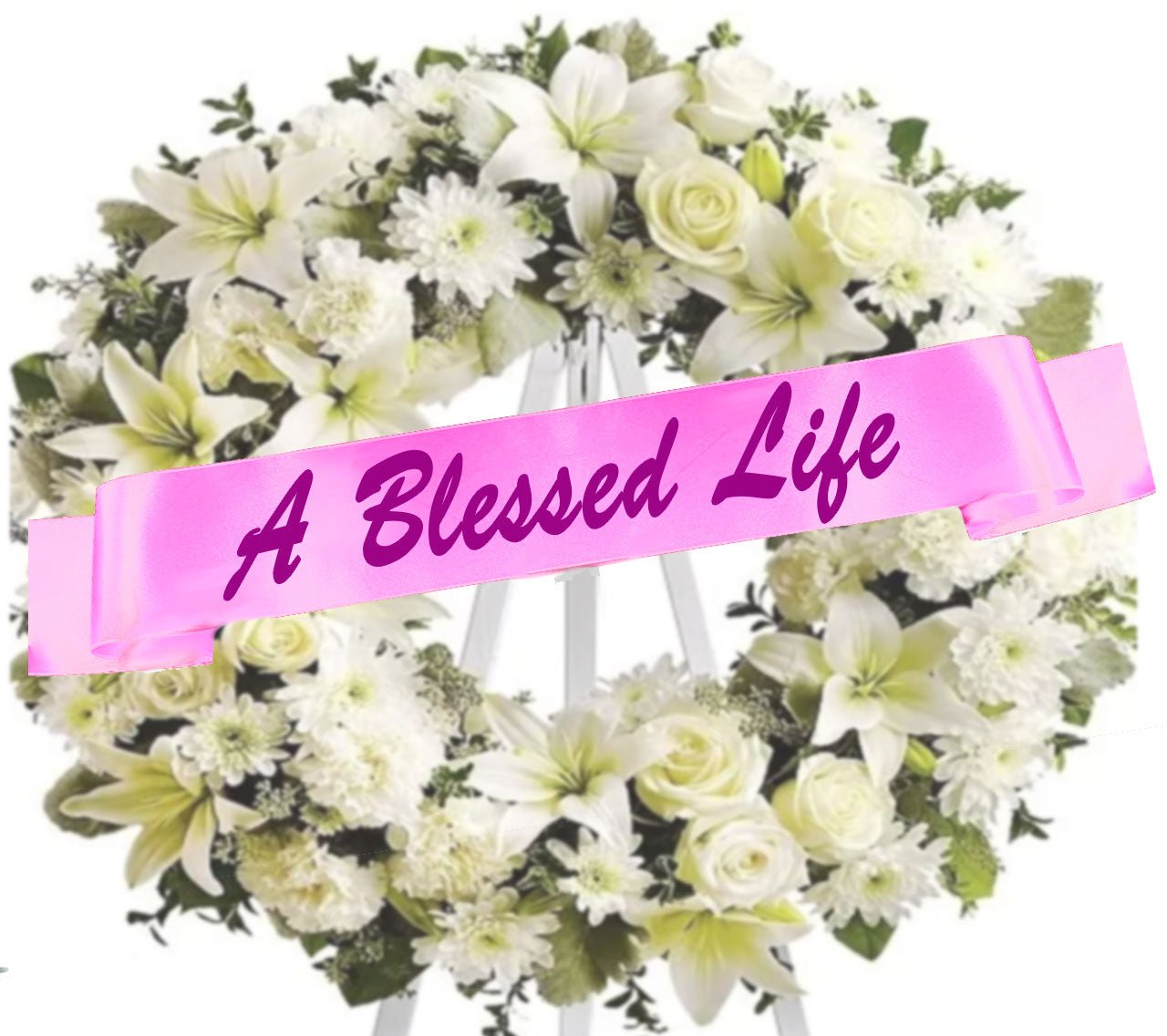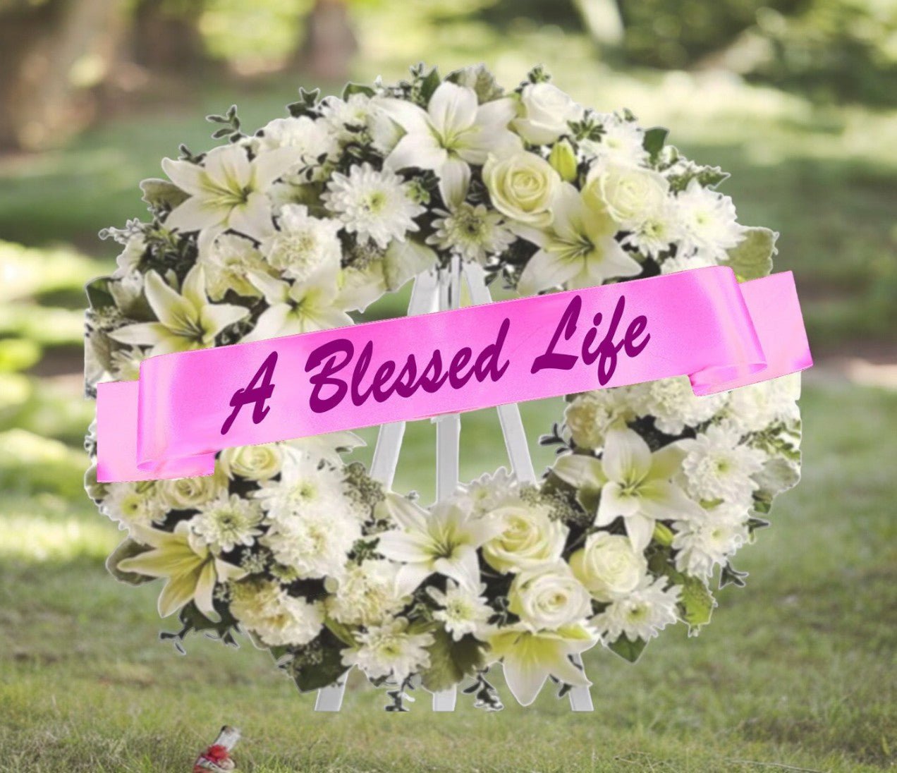 Add a touch of elegance and meaning to your loved one's funeral arrangement with our double faced satin funeral ribbon banner. Featuring the words 'A Blessed Life', this banner is ready to adorn any flower arrangement and serve as a beautiful tribute to the life of your loved one.