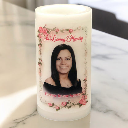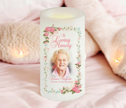 The Funeral Program Site offers the Blush Personalized Flameless LED Memorial Candle, elegantly designed with a trailing vine of soft pink roses that gently frames your loved one’s photo and custom text. The artwork is not a sticker—it is embedded directly into a thin outer layer of real wax, creating a lasting memorial keepsake that will continue to look beautiful over time. The warm pink tones and floral accents bring a sense of tenderness and peace, making this candle suitable for display at services or in a quiet space at home.