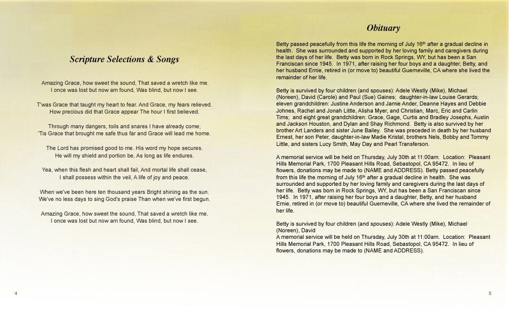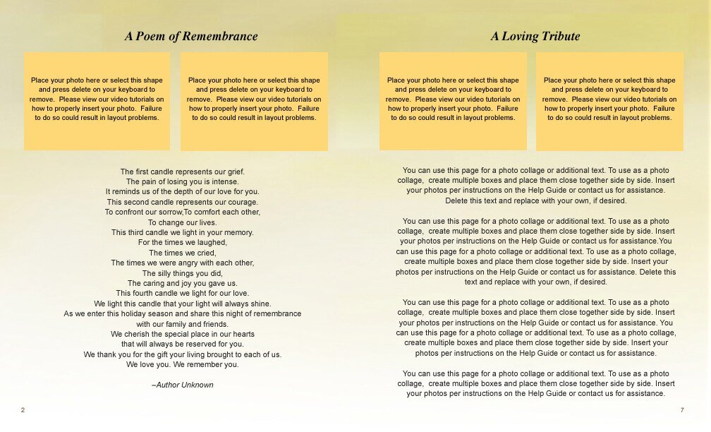 Funeral booklets formatted in an 8-page or 8-sided layout (2 sheets printed front and back). Add more pages if needed. Ready to edit and print on your own home printer or local copy shop.