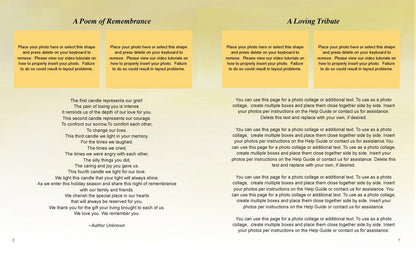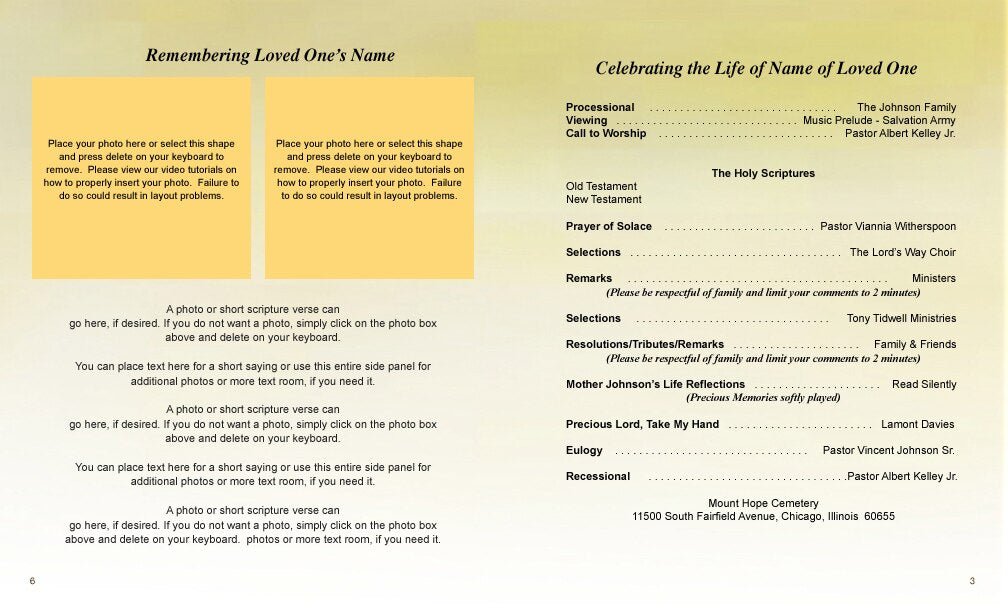A funeral booklet template is a pre-designed framework that helps individuals or families create a personalized funeral booklet for memorial services. These templates provide a basic structure, including a cover page, an internal layout for content, and a back cover, which users can customize with text, photos, and other personal touches. The primary purpose of these templates is to simplify the process of compiling a comprehensive and polished booklet that honors the life of the deceased while providing attendees with a guide to the funeral or memorial service.