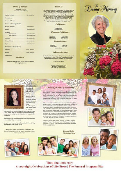 Inside, the funeral brochure continues with a matching backdrop, offering space for cherished photos, personal messages, and service details. Fully customizable, it allows families to personalize every element to reflect their loved one’s memory. This funeral brochure serves as a treasured keepsake for family and friends, providing comfort and a lasting tribute to a life well celebrated.