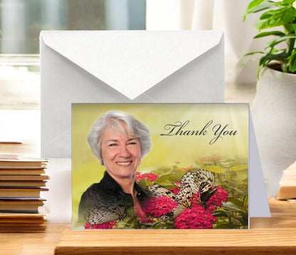 Bouquet Funeral Thank You Card Design & Print offers a graceful and vibrant expression of gratitude with its radiant golden background and striking red flower blossoms. The addition of Monarch butterflies adds a touch of elegance and symbolism, representing transformation and remembrance. Bouquet Funeral Thank You Card Design & Print is a beautiful way to honor your loved one while thanking those who offered support during a difficult time.