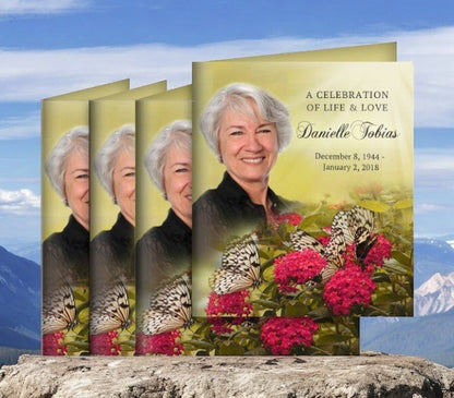 The Golden Bouquet Folded Memorial Card Design & Print radiates warmth and beauty with its elegant golden background adorned by vivid red blossoms and fluttering monarch butterflies. This luminous design creates a serene and uplifting atmosphere, providing a stunning backdrop for your loved one’s photo and personalized text. The golden hues and vibrant florals symbolize love, remembrance, and the enduring light they brought into your life.