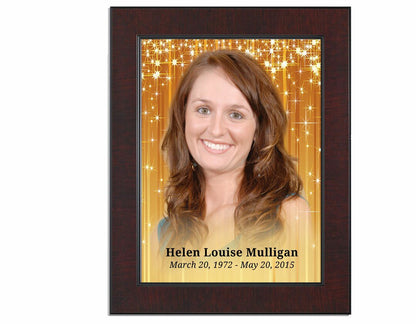 The Brilliance Funeral Poster Memorial Portrait from The Funeral Program Site offers a radiant and elegant way to honor your loved one’s memory. This beautiful design features a golden background with sparkling stars hanging gracefully above your loved one’s photo, creating a heavenly and comforting display. The warm golden tones evoke feelings of peace, light, and eternal love, making it a truly meaningful tribute.
