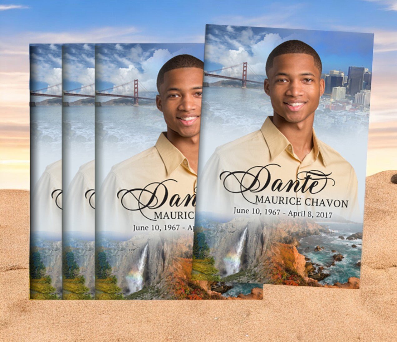 California Bifold Funeral Program Design & Print captures the warm spirit of the Golden State with a scenic backdrop that reflects natural beauty and peaceful landscapes. Whether inspired by the coast, palm-lined streets, or radiant sunsets, this design offers a heartfelt way to celebrate a life well lived. California Bifold Funeral Program Design & Print presents your loved one’s photo and information with grace and clarity, framed by a setting that evokes comfort and fond memories.