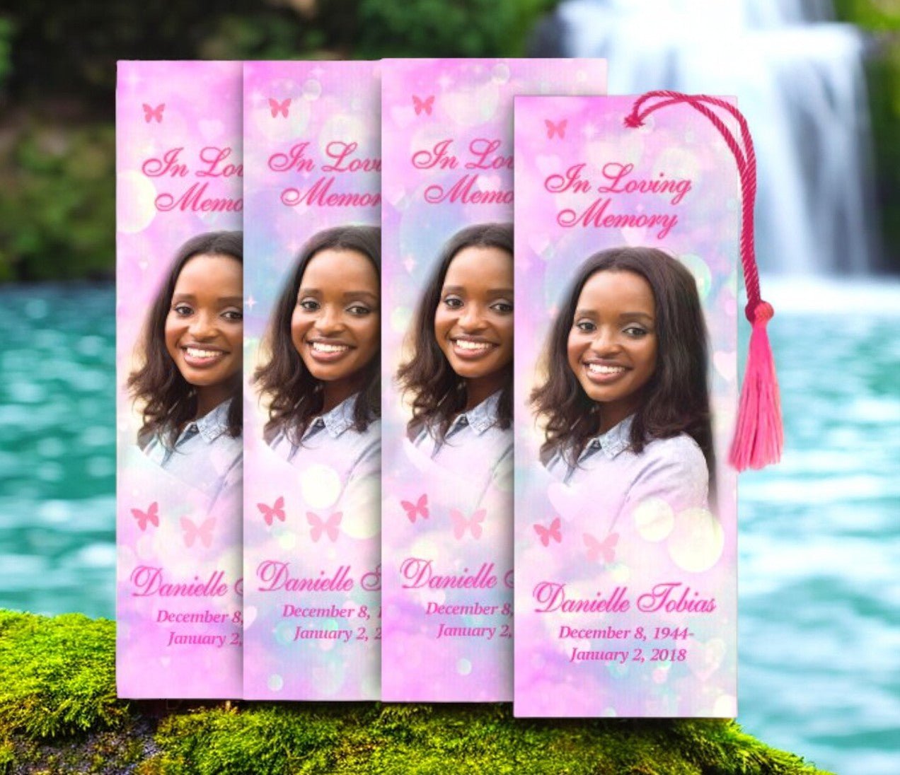 The Candy Memorial Bookmark Done For You Design & Print (Pack of 50) features a delightful pink-themed background accented with sparkling lights, delicate hearts, and fluttering butterflies. This soft and radiant design adds warmth and elegance, making it a beautiful way to honor your loved one’s memory. Its vibrant yet gentle tone perfectly captures feelings of love, remembrance, and celebration of life.