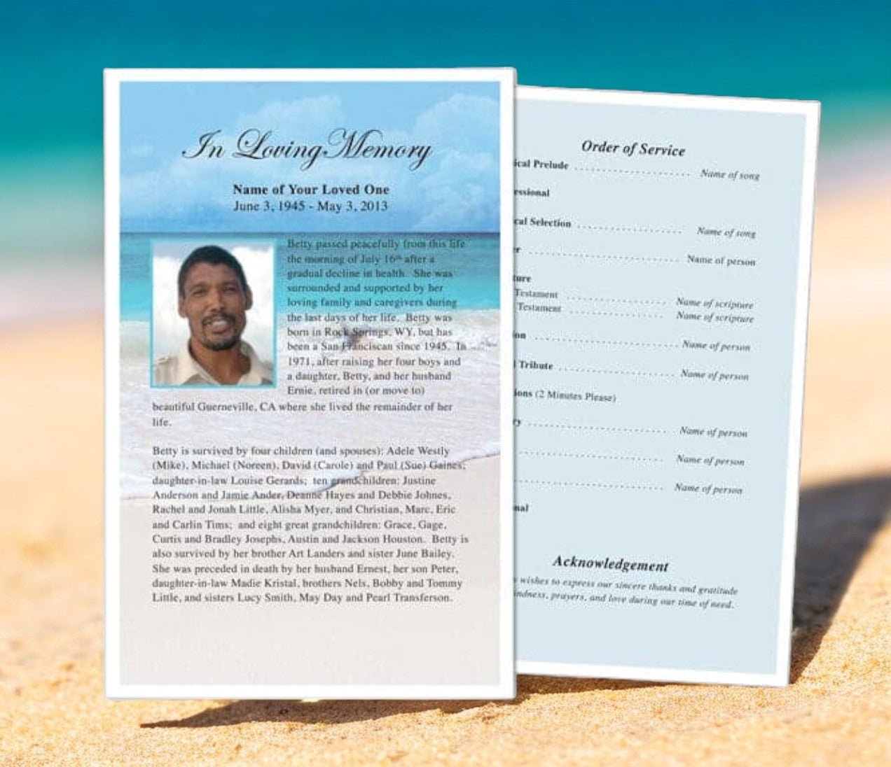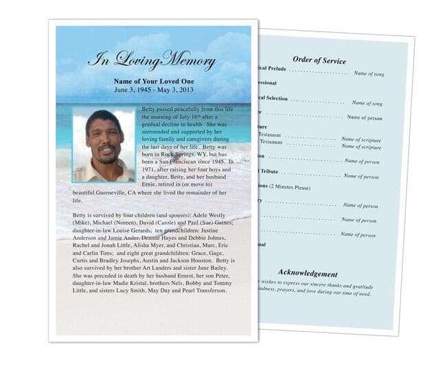 The Caribbean Funeral Flyer Template features a grand sun-kissed beach overlooking the Caribbean, evoking peace and warmth. The Caribbean Funeral Flyer Template is perfect for honoring a loved one who cherished the ocean or tropical landscapes. The beach imagery symbolizes tranquility and eternal rest.