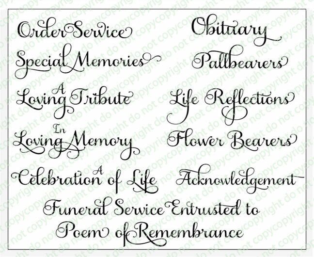 The Funeral Program Site introduces The Carole Funeral Program Title Word Art Pack of 12, a stunning collection of elegant headings crafted with fancy script lettering, graceful swish tails, and upright styling that brings instant sophistication to any memorial design. These beautifully scripted titles are ready to use and feature transparent backgrounds, making them easy to place over any colored or photo-based template while maintaining a polished, cohesive appearance. Whether you’re working with one of our professionally crafted templates or designing your own funeral program from scratch, The Carole Funeral Program Title Word Art Pack of 12 enhances the overall aesthetic with its refined and timeless presentation. Each title in this exclusive set helps elevate the emotional tone of your tribute, allowing you to create a heartfelt, visually stunning memorial with ease. This elegant pack ensures your program remains beautifully coordinated, meaningful, and dignified.