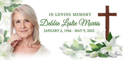 The White Lily Cross Casket Panel Insert features a serene floral and faith-inspired design, showcasing delicate white lilies and a rustic brown cross in the background. This elegant composition reflects purity, peace, and spiritual grace, making it a meaningful visual tribute during a memorial or funeral service.