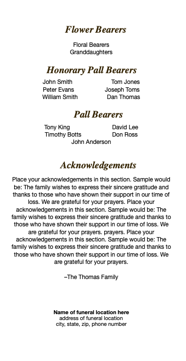 Utilize our template editing service and have our designer create your funeral brochure. Here is the comprehensive list of inclusions: