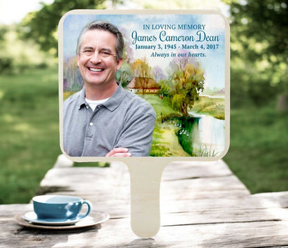 The Countryside All-In-One Memorial Hand Fan features a peaceful watercolor landscape with a small country home resting beside a calm lake and mature birch trees. The gentle colors and serene scenery create a comforting setting that beautifully complements your loved one’s memory.