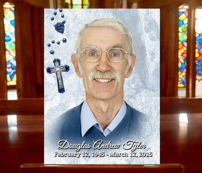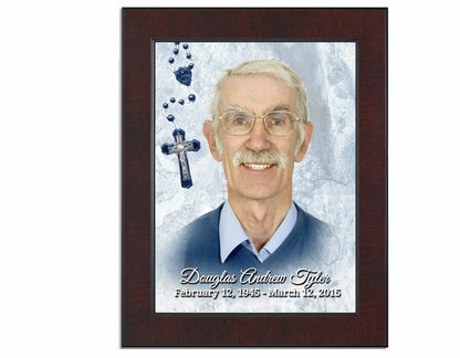 The Crucifix Funeral Poster Memorial Portrait from The Funeral Program Site is a deeply spiritual tribute that beautifully honors a loved one’s Catholic faith. This elegant design features a marble-inspired background accented with a delicate blue and silver rosary crucifix gracefully hanging beside your chosen photo. The subtle tones of marble paired with the shimmer of the crucifix create a peaceful and reverent atmosphere, reminding family and friends of faith, love, and eternal life.